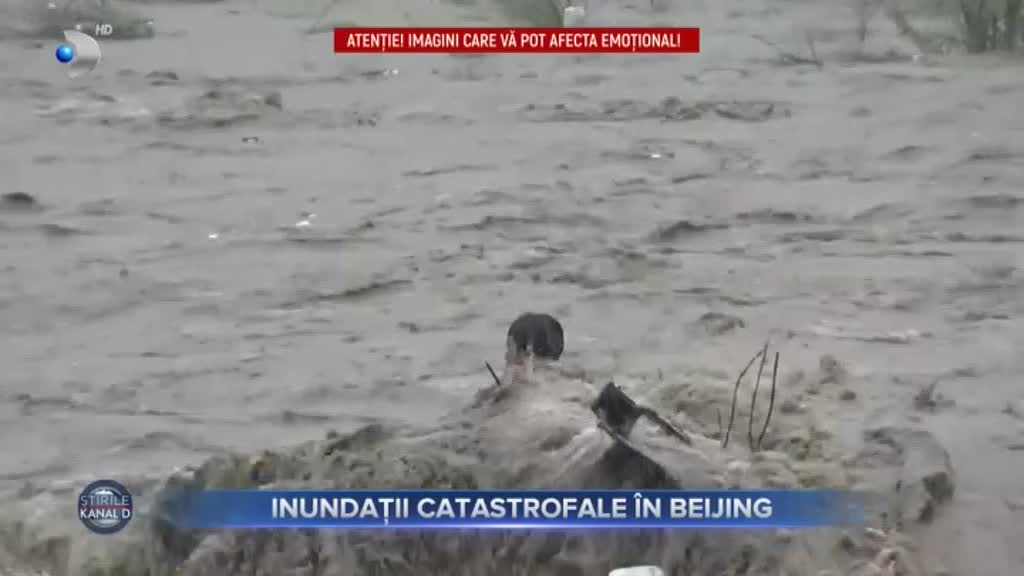 Beijing este sub alertă maximă de inundații și alunecări de teren din cauza unui ciclon. Cel puțin două persoane și-au pierdut viața numai astăzi, iar operațiunile de salvare sunt extrem de dificile. Mulți au fost prinși în mașinile luate de ape. Un bărbat se agață cu ultimele forțe de acoperișul autoturismului său care este în mijlocul unui râu.
