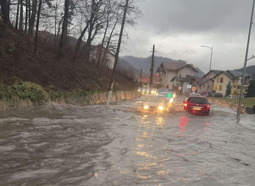 Nivelul apei este de aproximativ 50-60 de centimetri, iar circulaţia rutieră se desfășoară cu dificultate în zonă.