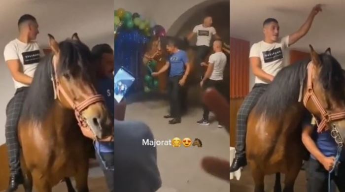 Se pare că băiatul nu a luat această decizie singur, întrucât, în imaginile ajunse virale pe rețelele de socializare se poate observa că cel care îndrumă animalul este chiar tatăl sărbătoritului.