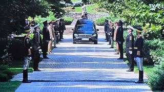 Sicriul în care se află trupul fostului președinte Ion Iliescu a fost preluat din Sala Unirii și este purtat de opt militari spre Biserica de la Cotroceni.