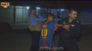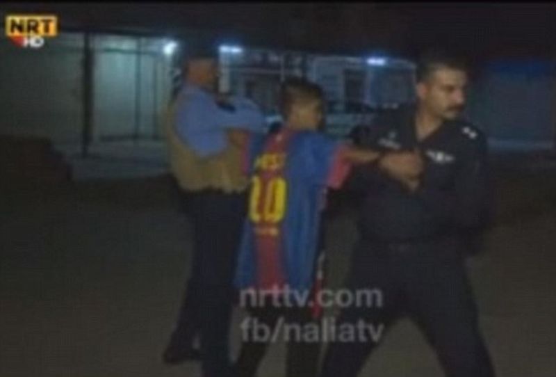 Baiatul, care purta un tricou in culorile echipei de fotbal FC Barcelona a izbuncit in plans in momentul in care a fost capturat de politistii din Kirkut, oras situat la nord de Bagdad. Autorităţile