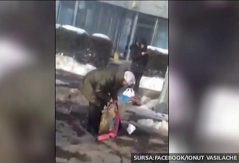 Femeia din imagini, care-si aduna cumparaturile de pe jos, a fost lovita de masina gri din imagini: un autoturism neinscriptionat al politiei rutiere, in care se aflau doi agenti.