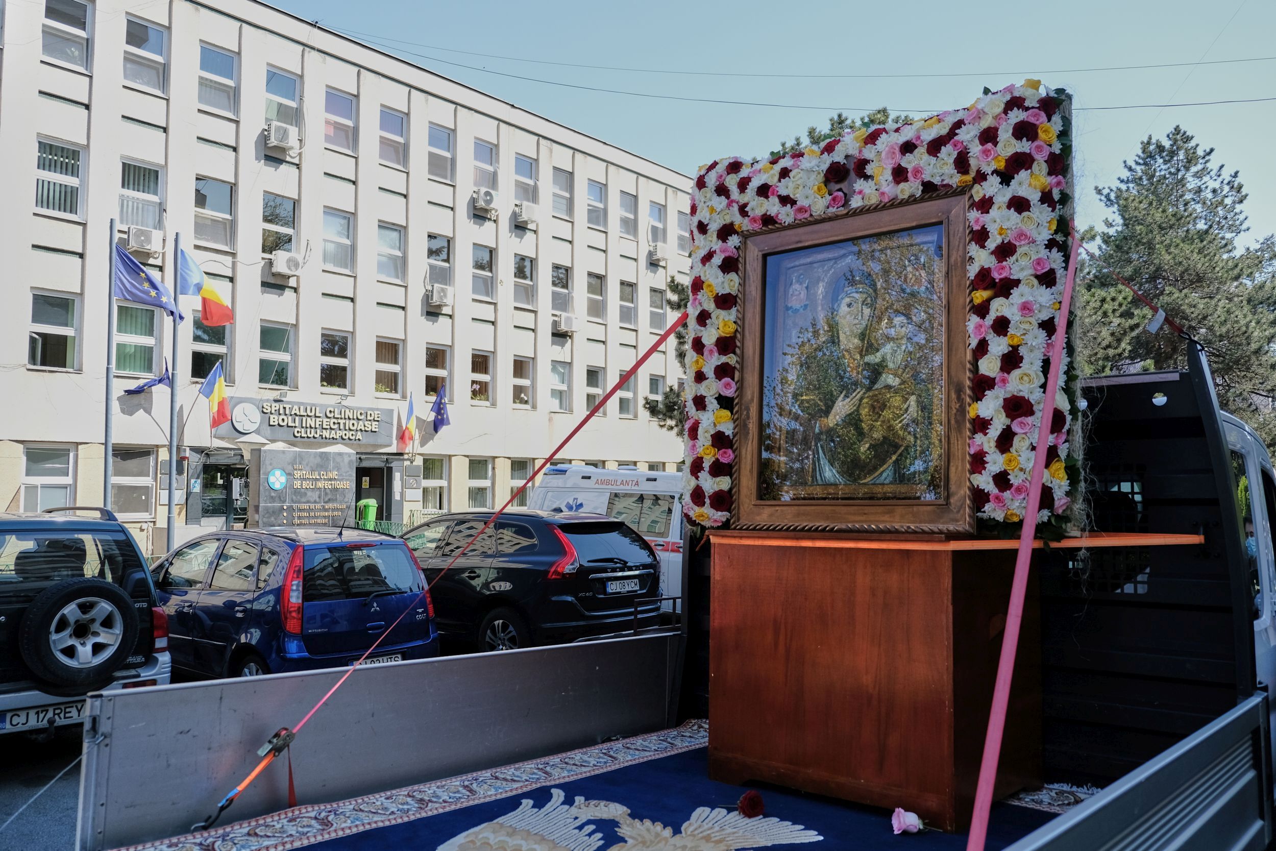 1 din 3 | O platforma auto poarta Icoana facatoare de miniuni a Maicii Domnului de la manastirea Nicula, intr-o procesiune religioasa dedicata sarbatorii Izvorul Tamaduirii