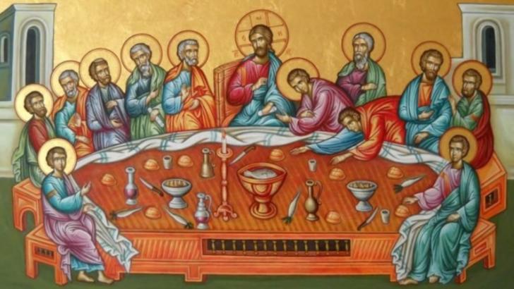 Joia Mare. În Sfânta și Marea zi Joi, așa cum este mărturisit în sinaxarul Utreniei, dumnezeieștii Părinți, care pe toate le-au rânduit bine, urmând predaniilor dumnezeieștilor Apostoli și Sfintelor Evanghelii, ne-au lăsat spre prăznuire patru lucruri: sfânta spălare a picioarelor; Cina cea de Taină, adică încredințarea înfricoșătoarelor Taine, rugăciunea cea mai presus de fire și Vânzarea Domnului.