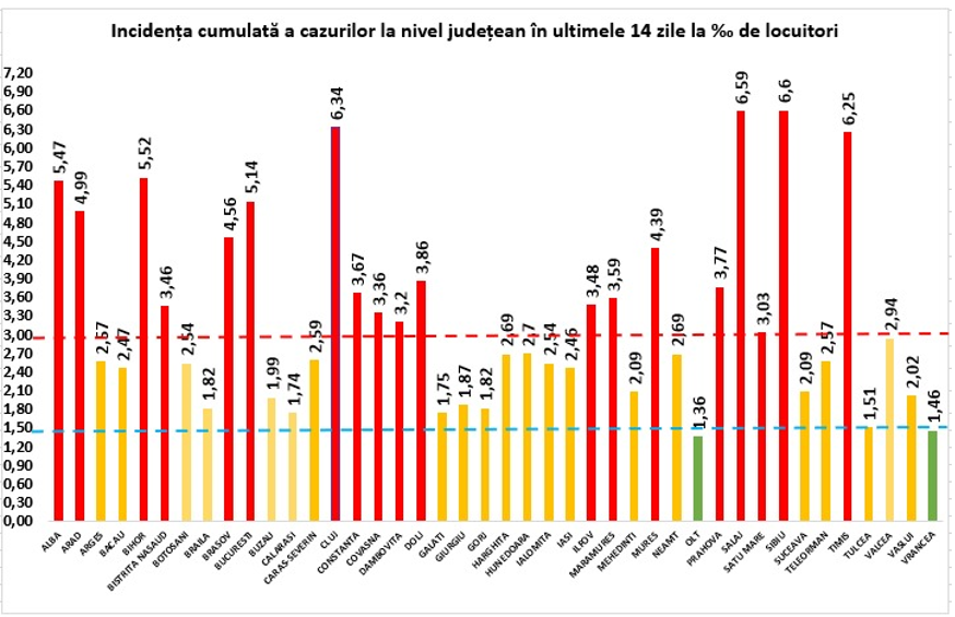 Cele patru județe care au o rată a incidenței cazurilor de coronavirus de peste 6 la mie, în ultimele 14 zile, sunt Sibiu- 6,60, Sălaj- 6,59, Cluj- 6,34, Timiș- 6,25. În Capitală, rata incidenței a urcat la 5,14.
