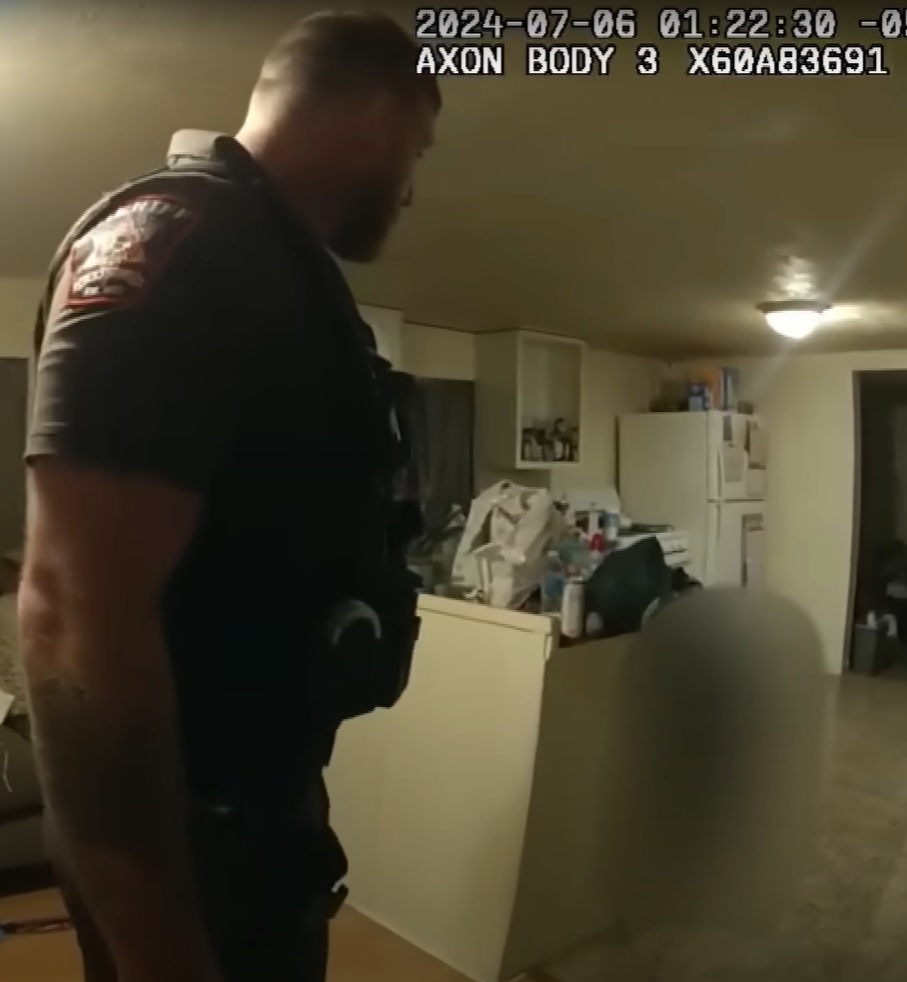 Femeia a luat oala și s-a ghemuit în spatele bufetului, dar ofițerii au continuat să strige la ea să lase oala, aparent pentru „a preveni un incendiu”.