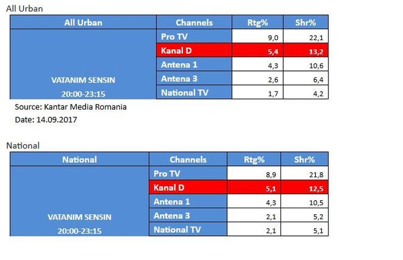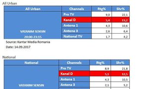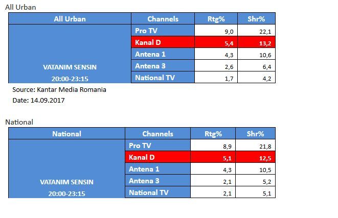 Aseara, in intervalul mentionat mai sus, Kanal D a inregistrat 5,4% rating si 13,2% cota de piata, pe targetul All Urban, si 5,1% rating si 12,5% cota de piata, pe targetul National.