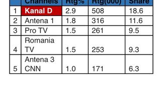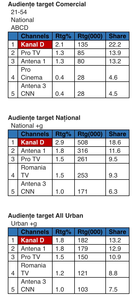 Astfel, în intervalul 12:00-13:00, Kanal D a fost prima opțiune a telespectatorilor, înregistrând 2,1% puncte de rating și 22,2% cotă de piață, pe targetul Comercial (21-54 Național ABCD), 2,9% rating și 18,6% cotă de piață, în rândul publicului din întreaga țară, target Național, și 1,8% rating și 13,2% cotă de piață, în rândul publicului de la orașe, target All Urban,