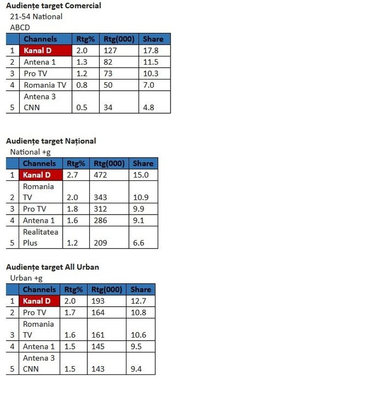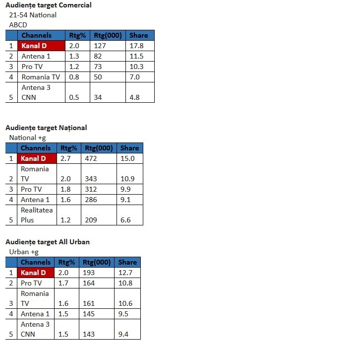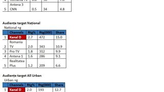 Astfel, în intervalul 12:00-13:00, Kanal D a fost prima opțiune a telespectatorilor, înregistrând 2,0% puncte de rating și 17,8% cotă de piață, pe targetul Comercial (21-54 Național ABCD), 2,7% rating și 15,0% cotă de piață, în rândul publicului din întreaga țară (target Național), și 2,0% rating și 12,7% cotă de piață, în rândul publicului de la orașe (target All Urban).