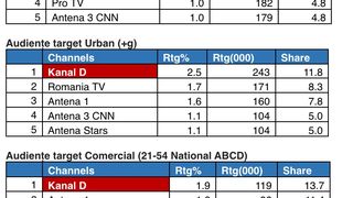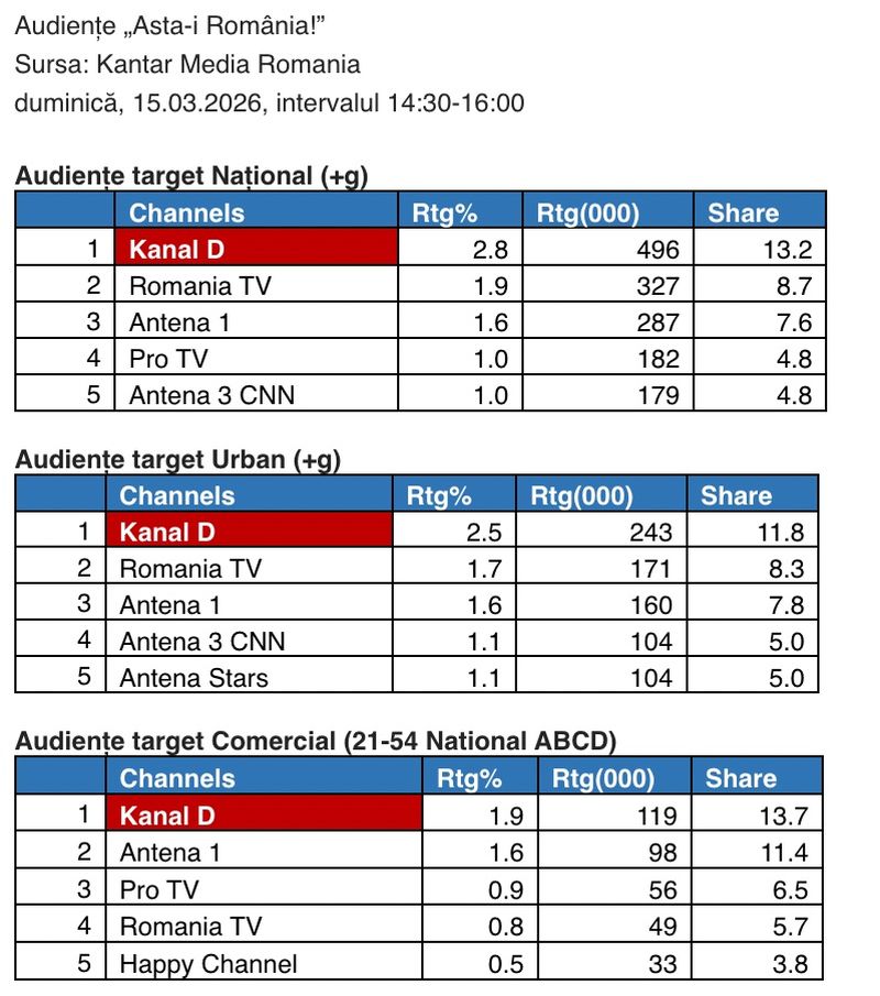 Duminică, 15 martie, emisiunea de reportaje „Asta-i România!”, prezentată de Mihai Ghiță, a poziționat Kanal D pe primul loc în topul audiențelor pe toate targeturile monitorizate, în intervalul 14:30 – 16:00, potrivit datelor furnizate de Kantar Media România.