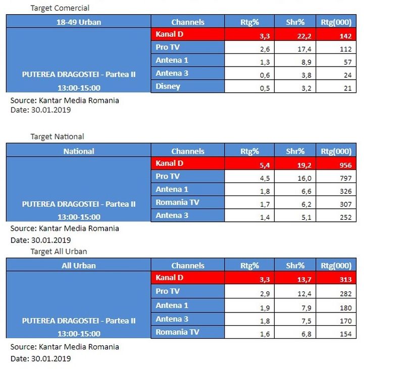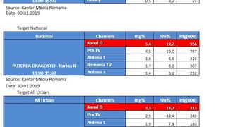 Conform datelor furnizate de Kantar Media, Kanal D a inregistrat ieri, in intervalul 13:00 – 15:00, 3,3% rating si 22,2% cota de piata, pe targetul Comercial, 5,4% rating si 19,2% cota de piata, pe targetul National, si 3,3% rating si 13,7% cota de piata, pe segmentul de public All Urban.