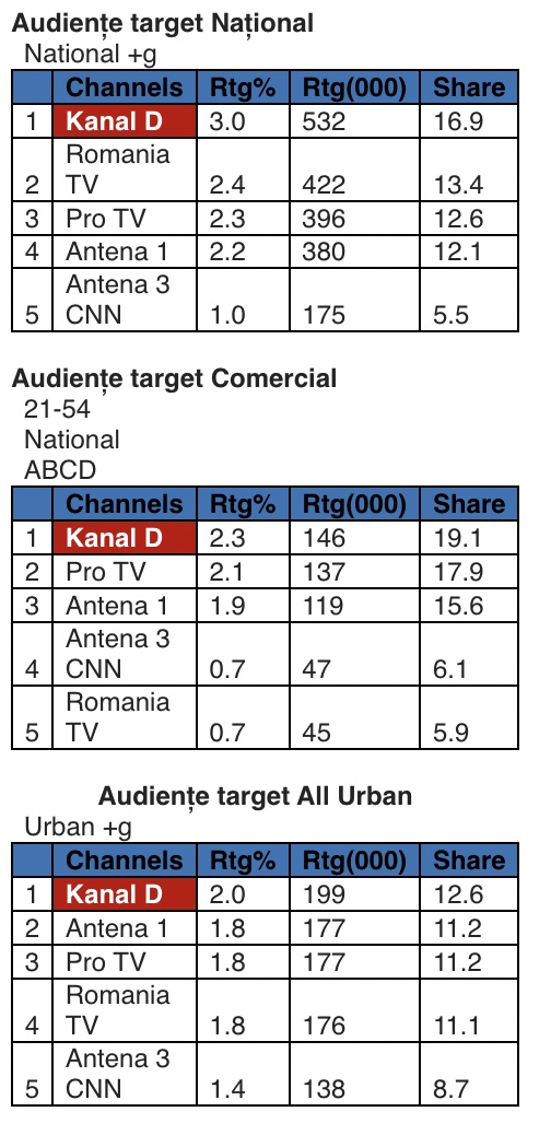 Astfel, în intervalul difuzării buletinului informativ al Știrilor Kanal D, 12:00-13:00, stația TV s-a clasat pe prima poziție în preferințele telespectatorilor din întreaga țară, înregistrând 3,0% puncte de rating și 16,9% cotă de piață, pe targetul Național, 2,3% puncte de rating și 19,1% cotă de piață, la nivelul targetului Comercial (21-54 Nat ABCD) și 2,0% rating și 12,6% cotă de piață, în rândul publicului
