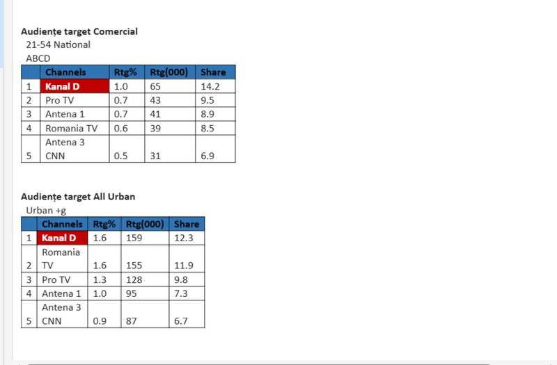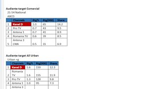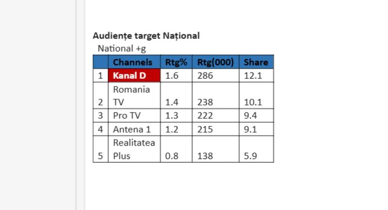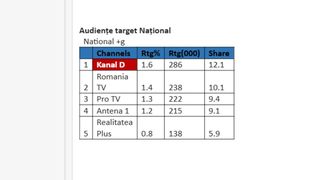 Astfel, în intervalul difuzării buletinului informativ, 12:00-13:00, Kanal D a fost prima opțiune a telespectatorilor, înregistrând 1,0% puncte de rating și 14,2% cotă de piață, pe targetul Comercial, 1,6% puncte de rating și 12,3% cotă de piață, în rândul publicului de la orașe (All Urban), și 1,6% puncte de rating și 12,1% cotă de piață, la nivelul întregii țări.