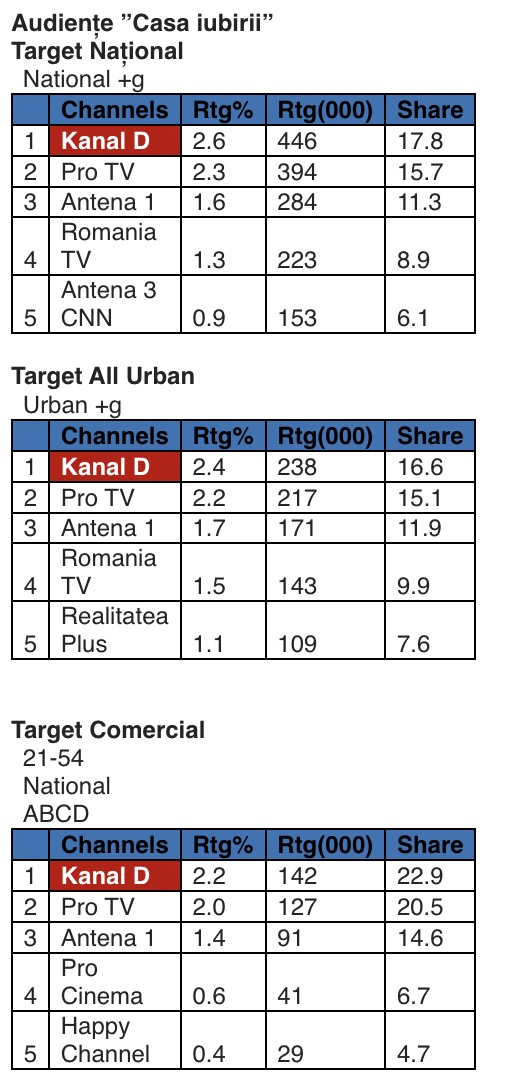 Astfel, prima parte a emisiunii cu și despre dragoste, difuzată în intervalul 10:00-12:00, a înregistrat, 2,6% puncte de rating și 17,8% cotă de piață, în rândul publicului din întreaga țară, target Național, 2,4% puncte de rating și 16,6% cotă de piață, în rândul populației de la orașe, targetul All Urban, și 2,2% rating și 22,9% cotă de piață, pe targetul Comercial (21-54 Nat ABCD), poziționând Kanal D pe locul I în topul audiențelor.