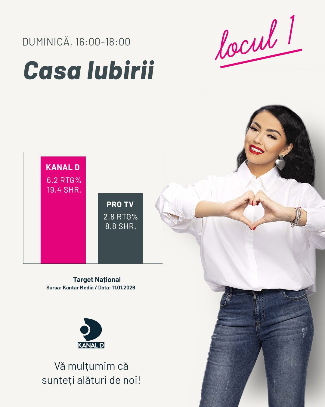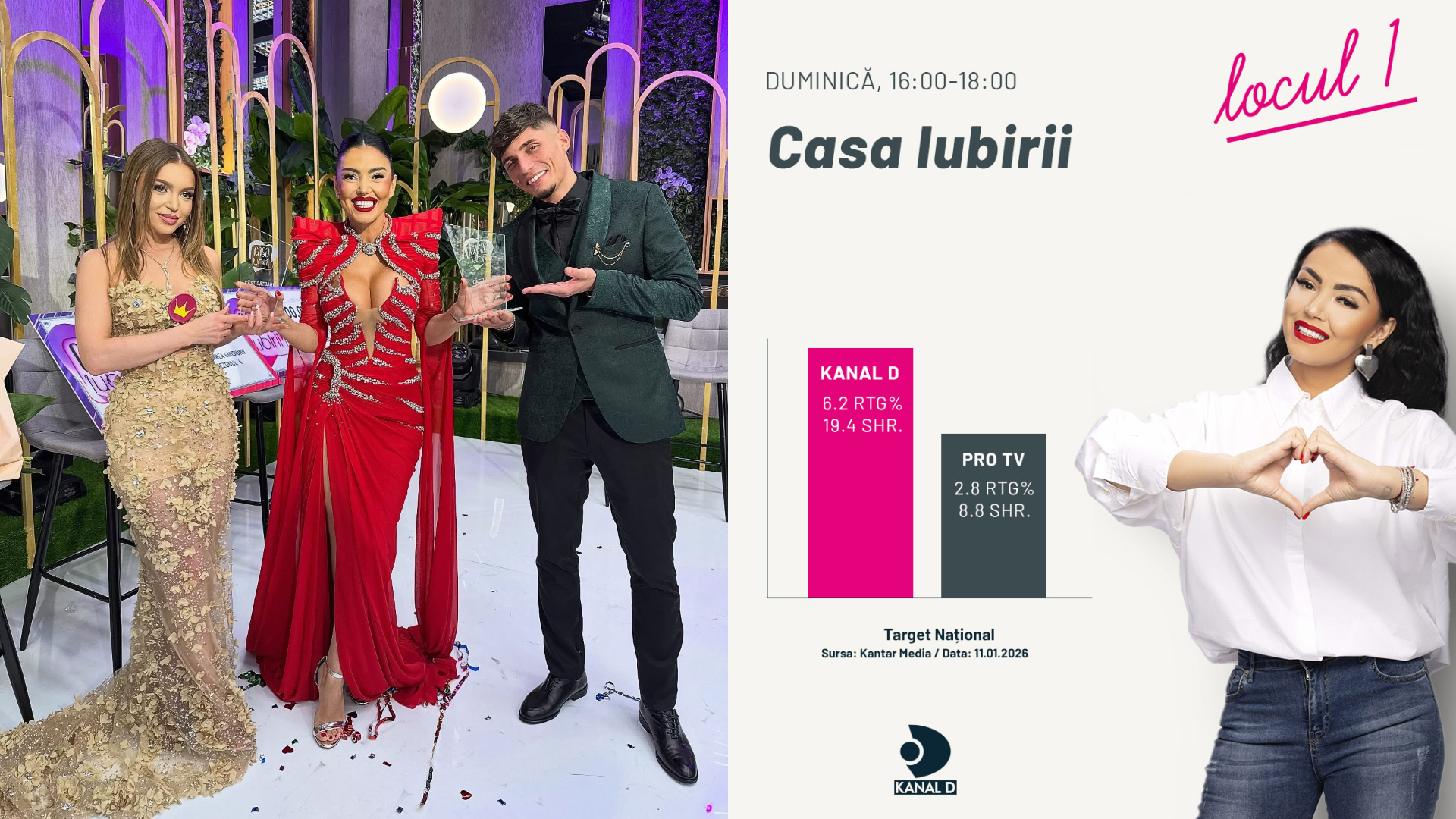 Marea Finală a sezonului 4 „Casa Iubirii” a plasat ieri Kanal D pe primul loc în clasamentele de audiență, atât la nivel Național, cât și în mediul urban, confirmând statutul emisiunii de cel mai iubit reality show cu și despre dragoste din România. Într-o seară încărcată de emoție, suspans și momente decisive, telespectatorii au stat cu sufletul la gură pentru a afla deznodământul competiției în care Veronica și Dorobanțu și-au adjudecat trofeele și premiile în valoare totală de 100.000 de lei pentru fiecare.
