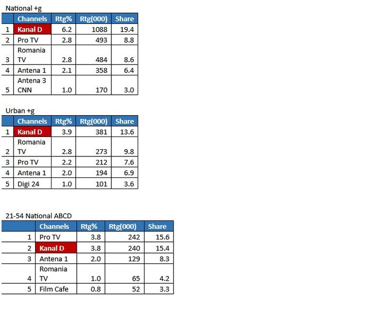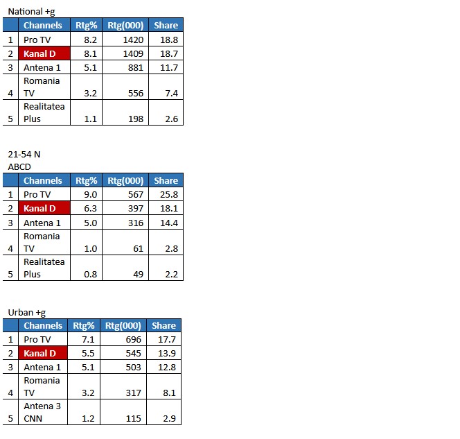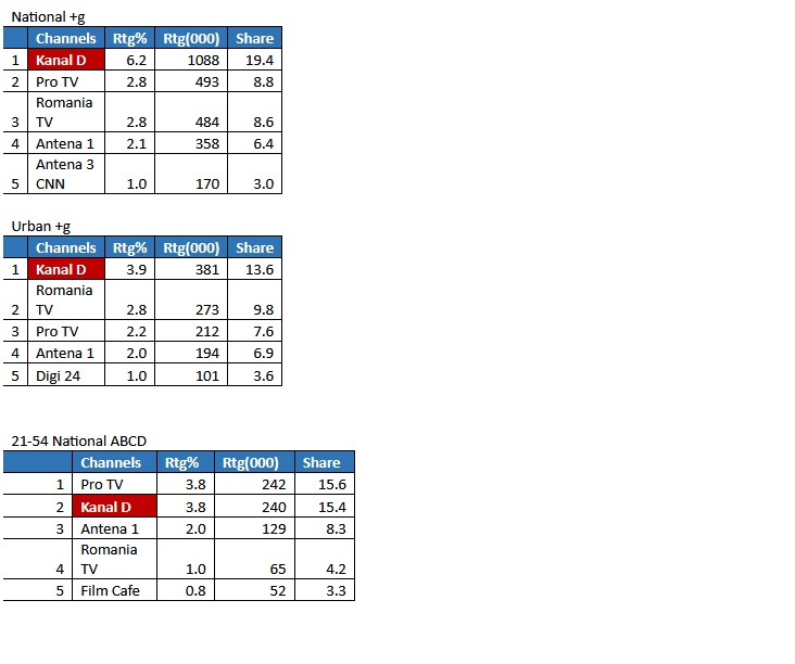 Astfel, prima parte a emisiunii a fost cel mai urmărit program la nivel Naţional, înregistrând 6,2% Rating şi aproape 20% cotă de piaţă (19,4%). De asemenea, pe targetul All Urban, statia s-a pozitionat tot pe locul 1 cu 3,9% Rating şi 13,6% cotă de piaţă. Pe tagetul Comercial, statia s-a aflat pe a doua pozitie, cu 3,8% Rating şi 15,4% cotă de piaţă.