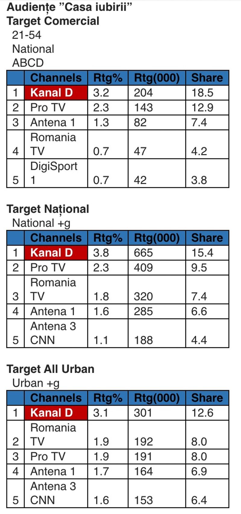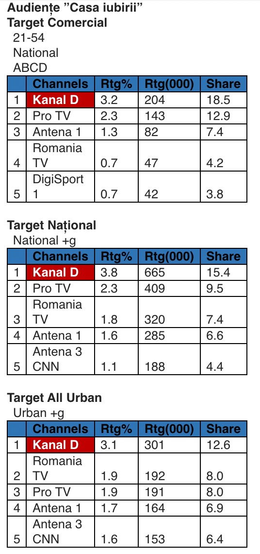 O medie de 665.000 de români au urmărit, în fiecare minut al difuzării, evenimentele petrecute în prima parte a emisiunii ”Casa iubirii”, iar minutul de aur, înregistrat la 17:55, a adunat în fața micilor ecrane 784.000 de fani ai celebrei emisiuni cu și despre dragoste, difuzată la Kanal D.