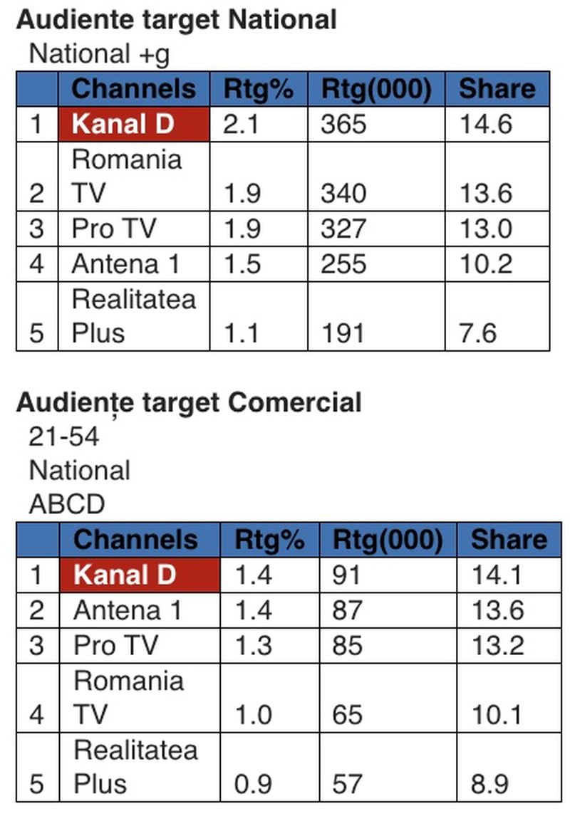 Ieri, în intervalul orar 10:00 – 12:00, prima parte a show-ului matrimonial “Casa Iubirii” a plasat Kanal D pe primul loc în topul televiziunilor, acumulând 2,1% puncte de rating și 14,6% cotă de piață, în rândul publicului din întreaga țară, și 1,4% rating și 14,1% cotă de piață, pe targetul Comercial (21-54 National ABCD), surclasând stațiile concurente.