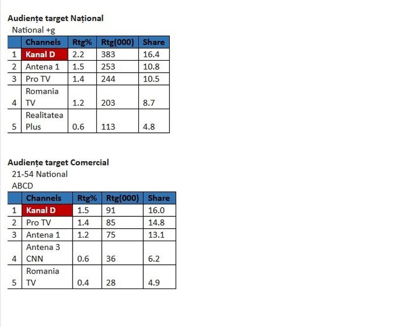 Kanal D a fost ieri, 11 decembrie, lider de audienţă, cu Știrile Kanal D, de la ora 12:00, prezentate de Cristina Dorobanțu, la nivelul întregii țări și în rândul publicului comercial, conform datelor furnizate de Kantar Media România.
