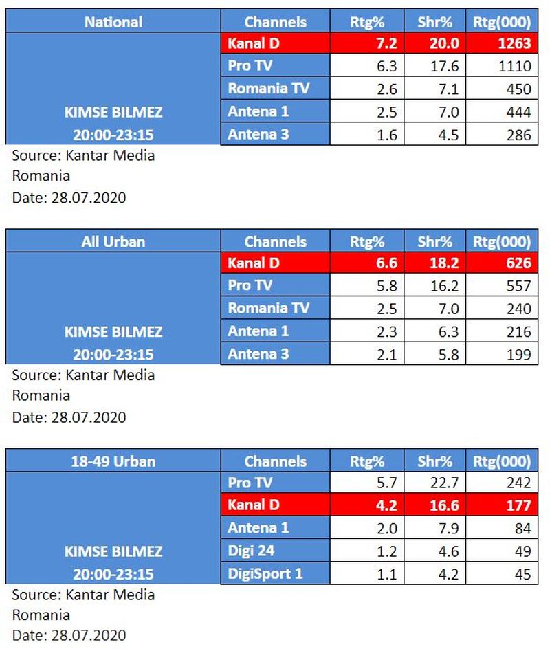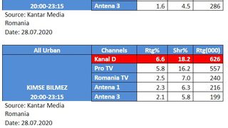 Conform datelor furnizate de Kantar Media, Kanal D s-a pozitionat pe primul loc in topul televiziunilor din Romania, in intervalul orar 20:00 – 23:15, cu 7,2% rating si 20,0% cota de piata, pe targetul National, si 6,6% rating si 18,2% cota de piata, pe targetul All Urban.