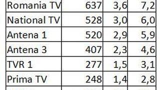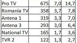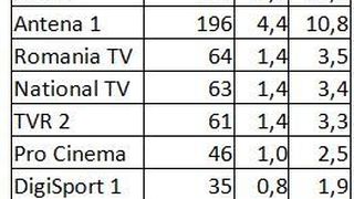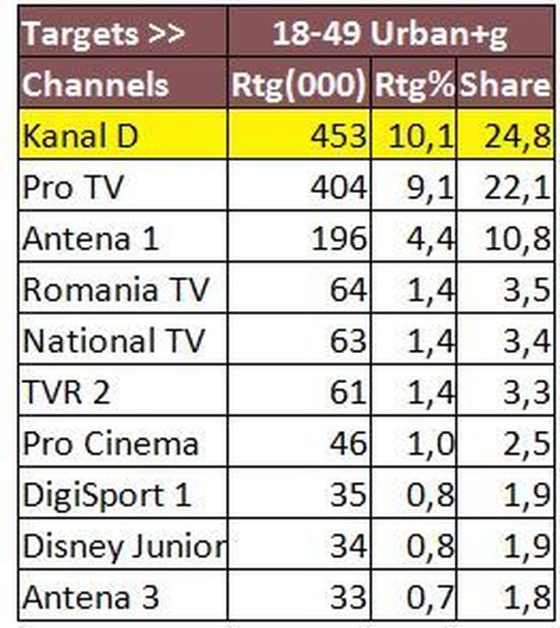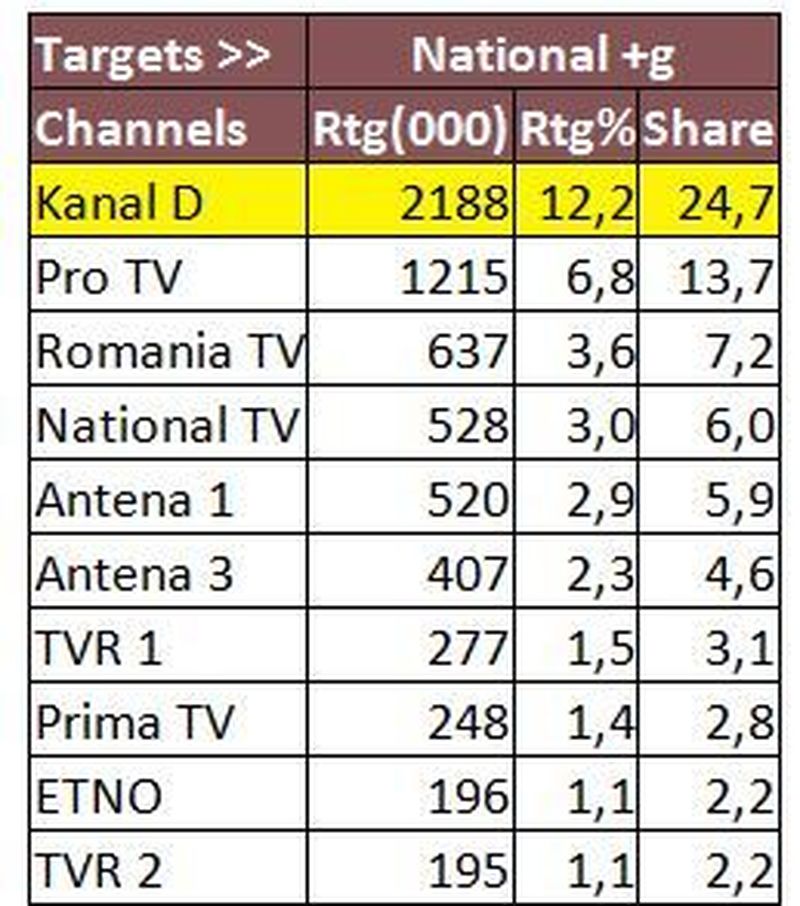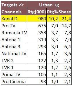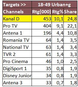 Prima pozitie de podium a fost ocupata de Kanal D, pe targetul Comercial, cu 10,1% Rating si 24,8% cota de piata; tot pe primul loc s-a plasat statia si in ceea ce priveste publicul de la orase, cu 10,2% Rating si 21,4% cota de piata, si la nivelul publicului National, cu 12,2% Rating si 24,7% cota de piata, in intervalul 20:15-23:15.