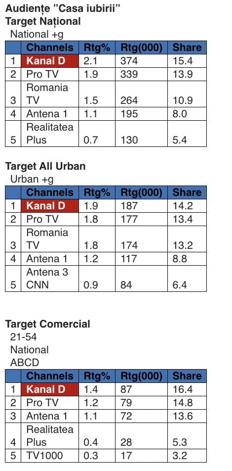Astfel, prima parte celebrului show matrimonial ”Casa Iubirii”, difuzată în intervalul 10:00 – 12:00, a înregistrat, 2,1% puncte de rating și 15,4% cotă de piață, în rândul publicului din întreaga țară, target Național, 1,9% puncte de rating și 14,2% cotă de piață, în rândul publicului de la orașe, target All Urban, și 1,4% rating și 16,4% cotă de piață, pe targetul Comercial (21-54 Nat ABCD), Kanal D surclasând, astfel, stațiile concurente, poziționându-se pe primul loc în topul audiențelor.