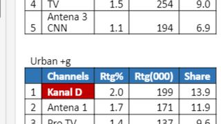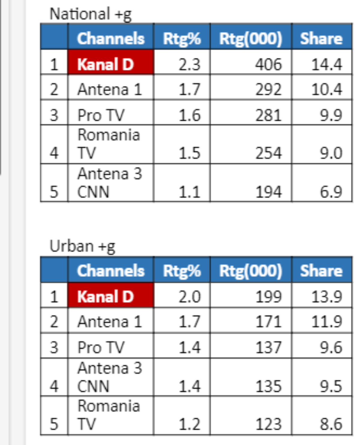 Astfel, în intervalul 12:00-13:00, Kanal D a fost prima opțiune a telespectatorilor din tara si de la orase, înregistrând 2,3% rating și 14,4% cotă de piață, pe targetul National, și 2,0% rating și 13,9% cotă de piață, pe targetul All Urban.