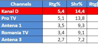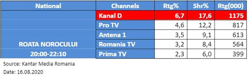 Duminica, 16 august, Kanal D a fost lider de piata, in Prime Time, cu emisiunea concurs “Roata Norocului”, atat la nivelul intregii tari, cat si in randul populatiei de la orase.