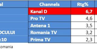 Ieri, in intervalul orar 20:00 – 22:10, Kanal D a fost lider de piata, cu 6,7% rating si 17,6% cota de piata, pe targetul National, si 5,4% rating si 14,4% cota de piata, pe targetul All Urban. Editia de aseara a emisiunii “Roata Norocului” a fost urmarita in medie, in fiecare minut al difuzarii, de peste 1.175.000 de romani din intreaga tara. Minutul de aur, atins la 22:04, a adunat in fata micilor ecrane, la Kanal D, peste 1.7 milioane (1.705.000) de telespectatori din intreaga tara.