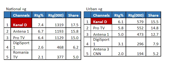 Astfel, ieri, în intervalul de difuzare a serialului 20:00 – 22:30, Kanal D a fost lider de piață, înregistrând 7,4% rating și 17,5% cota de piață, pe targetul Național, și 6,1% rating și 15,5% cota de piață, pe targetul All Urban.