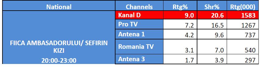 ineri, 7 ianuarie, Kanal D a fost lider de piață, în Prime Time, cu serialul fenomen “Fiica Ambasadorului”, atât în rândul publicului din întreaga țară, cât și în ceea ce privește populația de la orașe. Conform datelor furnizate de Kantar Media, Kanal D a înregistrat o cotă de piață de peste 20% pe targetul Național, și peste 16% cota de piață, pe targetul All Urban, surclasând astfel celelalte stații concurente, în intervalul de difuzare a serialului “Fiica Ambasadorului”.