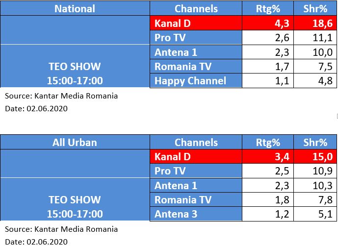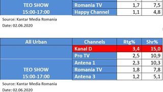 Marti, 2 iunie, Kanal D a fost lider detasat de piata, cu emisiunea “Teo Show”, postul TV pozitionandu-se pe primul loc in topul televiziunilor din Romania, conform datelor furnizate de Kantar Media.