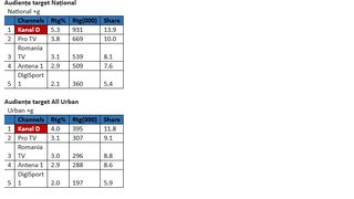 În intervalul difuzarii buletinului informativ Știrile Kanal D, 18:00-19:00, Kanal D a fost prima opțiune a telespectatorilor, înregistrând 5,3% puncte de rating și 13,9% cotă de piață, în rândul publicului din întreaga țară, și 4,0% rating și 11,8% cotă de piață, în rândul publicului de la orașe, surclasând astfel stațiile concurente.