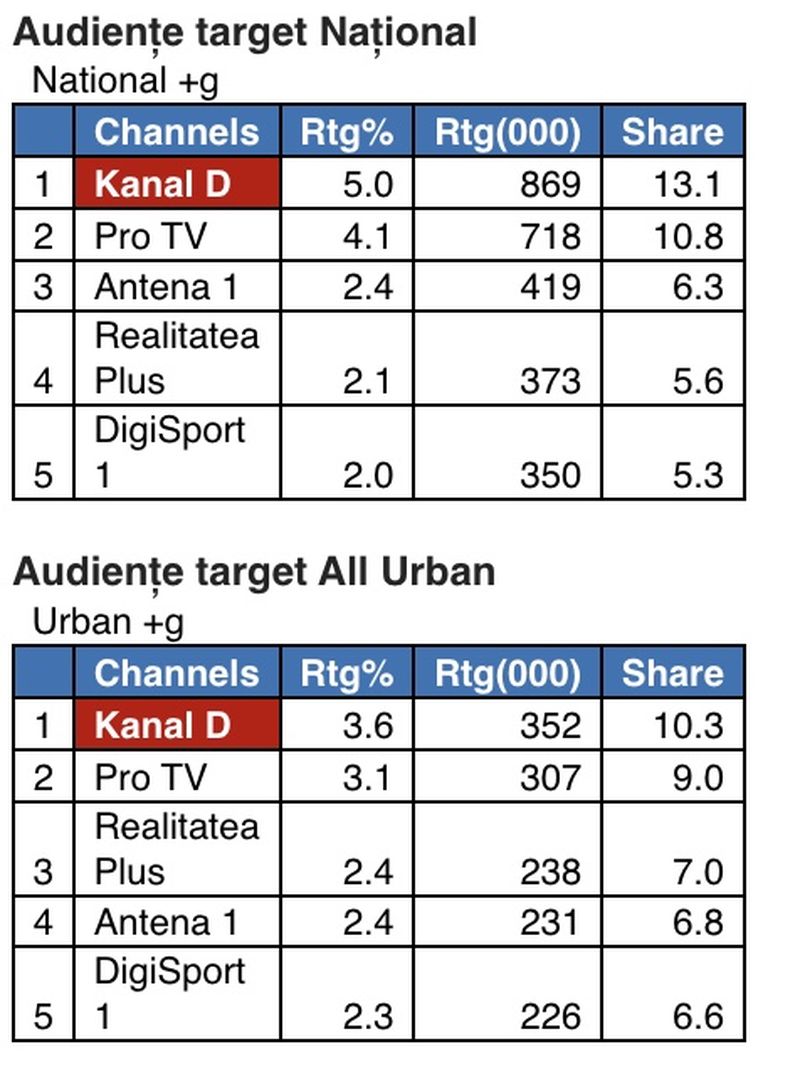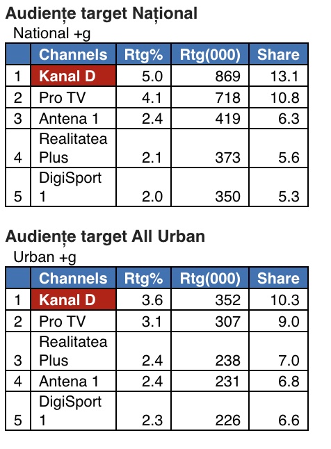 Astfel, în intervalul 18:00- 19:00, grupajul informativ al Kanal D, prezentat de Christian Sabbagh, a fost prima opțiune a telespectatorilor, înregistrând 5,0% rating și 13,1% cotă de piață, în rândul publicului din întreaga țară, iar la orașe stația a acumulat 3,6% puncte de rating si 10,3% cotă de piață, target All Urban.