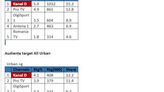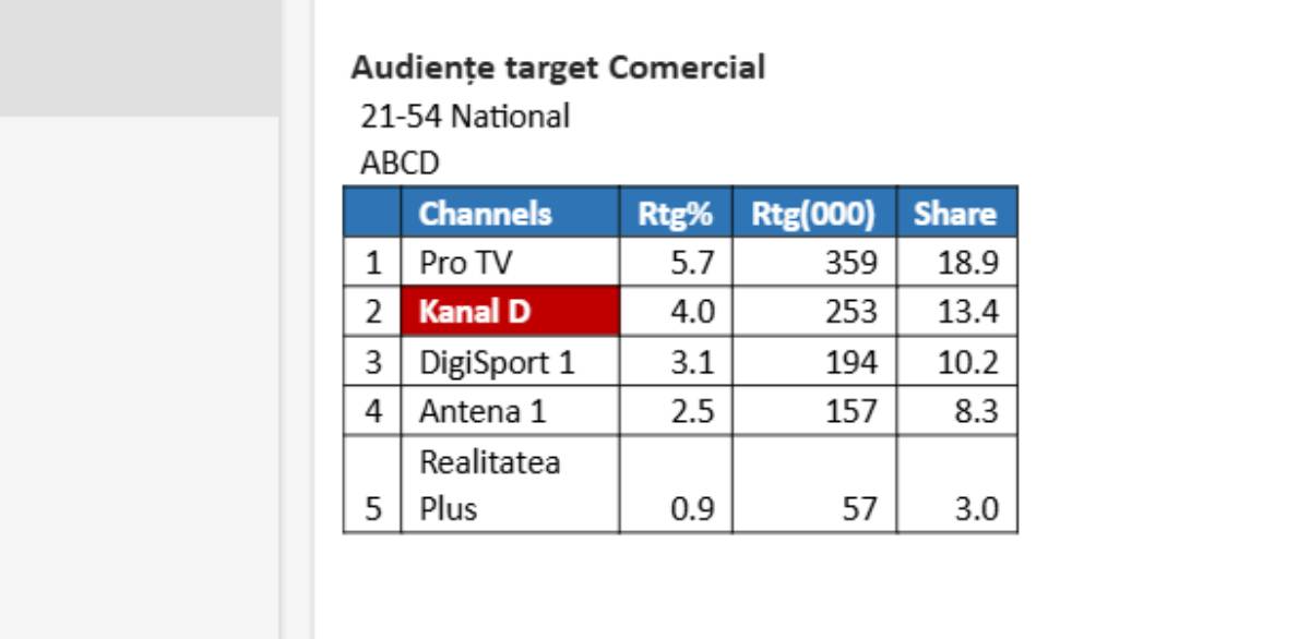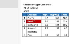 Pe targetul Comercial (21-54 Național ABCD), stația TV s-a clasat pe poziția secundă, acumulând 4,0% puncte de rating și 13,4% cotă de piață.
