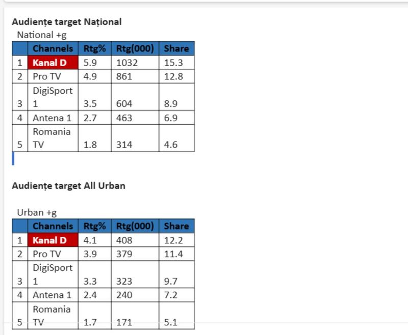 În intervalul difuzării buletinului informativ Știrile Kanal D, 18:00-19:00, Kanal D a fost prima opțiune a telespectatorilor, înregistrând 5,9% puncte de rating și 15,3% cotă de piață, în rândul publicului din întreaga țară, targetul Național, și 4,1% rating și 12,2% cotă de piață, în rândul publicului de la orașe, target All Urban, surclasând astfel stațiile concurente.