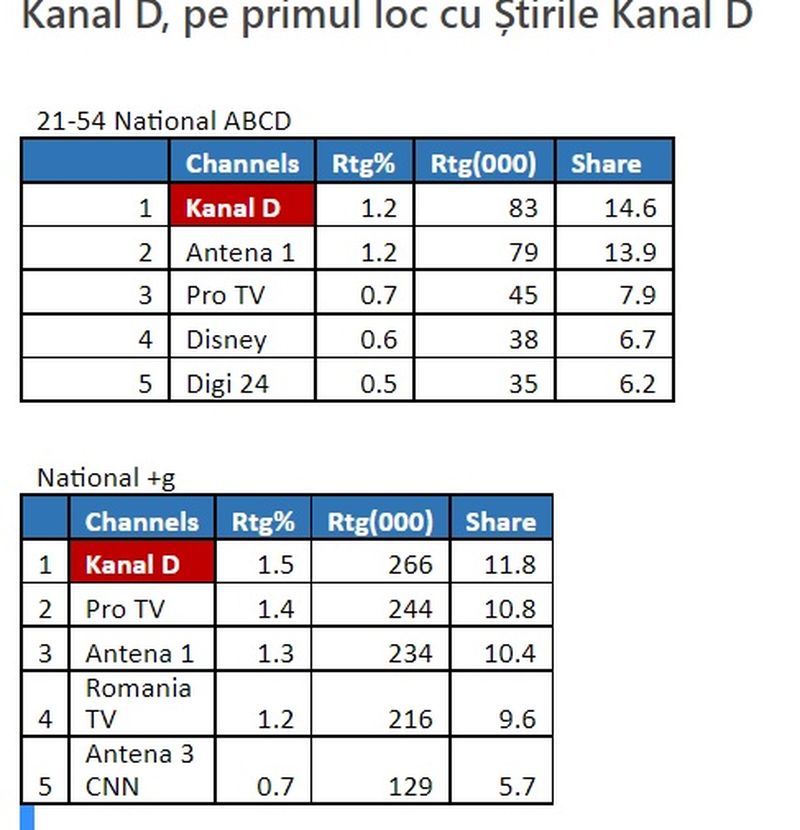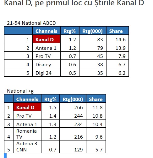 Conform datelor furnizate de Kantar Media, Kanal D a fost lider de piață cu Știrile Kanal D, atât la nivelul întregii țări, cât și pe targetul Comercial (21-54 ABCD).