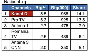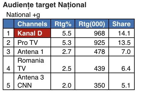 O medie de peste 968.000 de telespectatori din întreaga țară au urmărit ieri Știrile Kanal D, în intervalul sus-menționat, minutul de aur fiind înregistrat la 18:03, când peste 1 million de telespectatori (1.072.000) s-au aflat în fața micilor ecrane, urmărind ediția de seară a buletinului informativ de la Kanal D, prezentat de Christian Sabbagh.