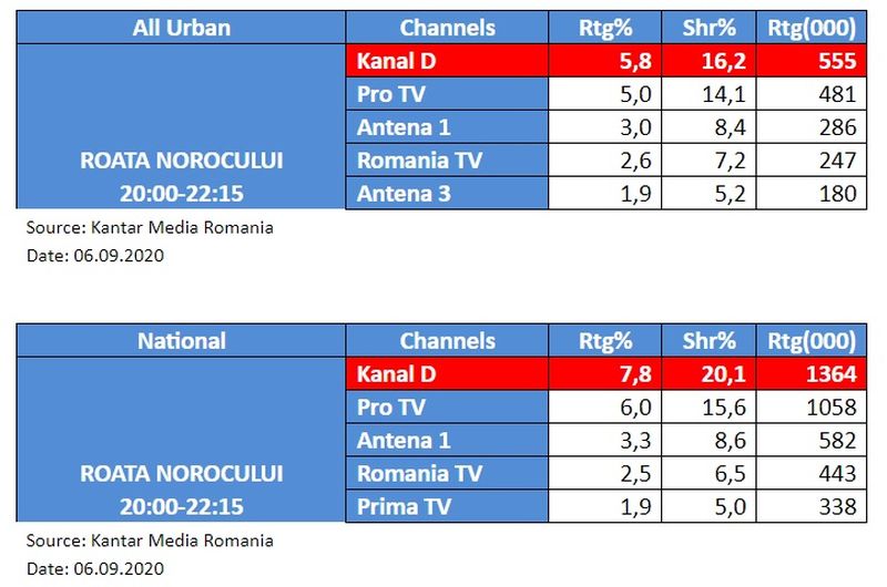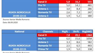 Ieri, in intervalul 20:00 – 22:00, Kanal D a fost lider de piata cu emisiunea prezentata de Bursucu si Ana-Maria Barnoschi, inregistrand 5,8% rating si 16,2% cota de piata, pe targetul All Urban, si 7,8% rating si 20,1% cota de piata, pe targetul National.