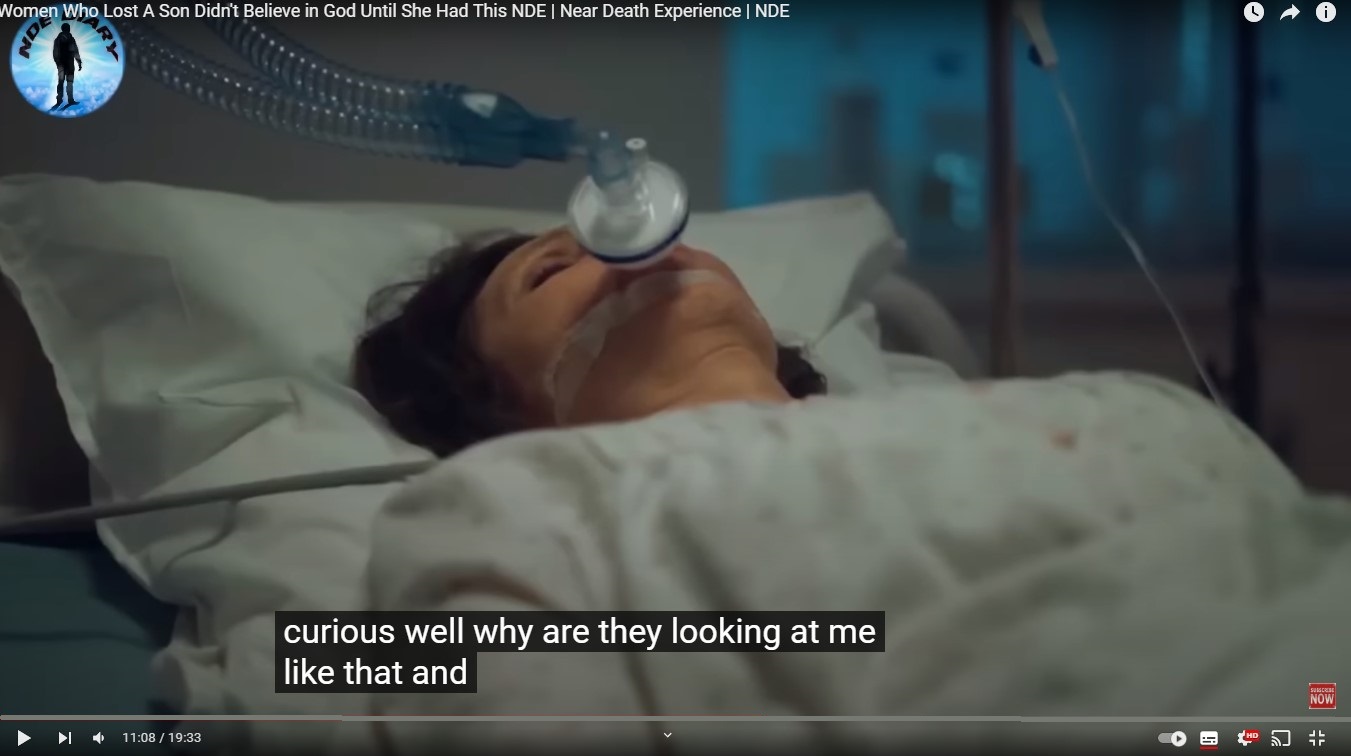 "Am privit apoi în jos și l-am văzut pe soțul și copiii mei, plângeau pentru că murisem și vroiam să le spun 'Nu, nu sunt moartă, sunt bine, totul este în regulă' Știam că este ok să-i părăsesc, că vor fi bine fără mine. Așa că am coborât în continuare prin tunel și mi-a venit gândul 'Nu există Dumnezeu' și atunci am simțit un zgomot puternic în cap, ca și cum o locomotivă era lângă mine".