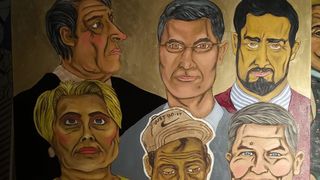 1 din 4 | Klaus Iohannis şi Viorica Dăncilă au fost pictaţi în acelaşi tablou înaintea alegerilor prezidenţiale! În faţa lor se află un votant cu sticla de tărie în mână!