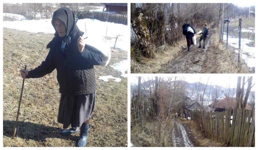 O bătrână în vârstă de 88 de ani dintr-un sat din Maramureș este nevoită să străbată un drum de ore întregi, plin de noroi, peste dealuri pentru a-și procura pâine.
