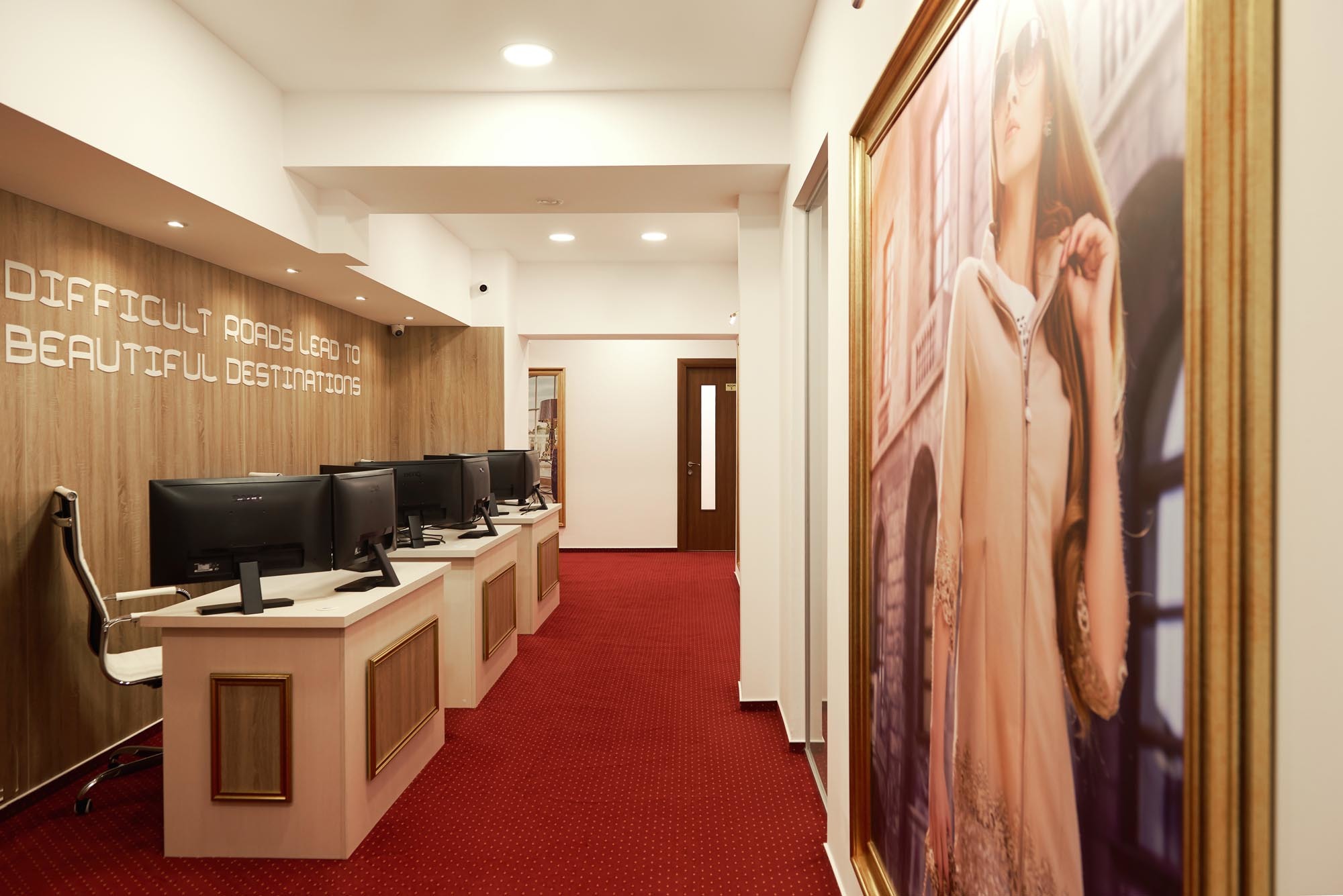 -aici nimeni nu este discriminat, fetele pornesc de la sanse egale. Tuturor li se fac sedinte foto, iar fotografiile erotice sunt puse pe site-ul agentiei, care poate fi accesat numai din strainatate. Fiecarei fete i se mobileaza sau amenajeaza camera in functie de personalitatea ei.