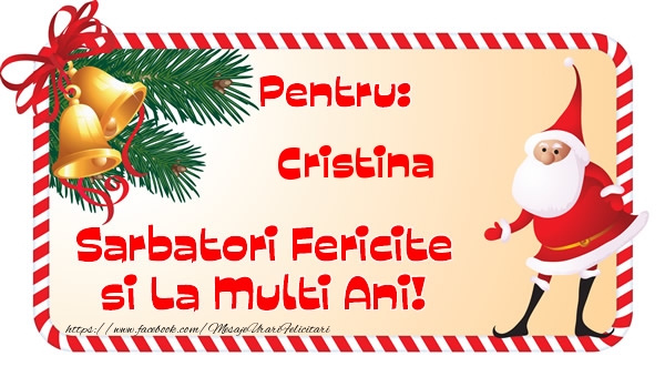 Prenume feminine: Cristina- 286.616, Cristiana- 26.678, Krisztina- 6.457, Cristinela- 769, Kristina- 728, Kristiana- 157, Crăciuniţă- 128, Crăciunică- 45,