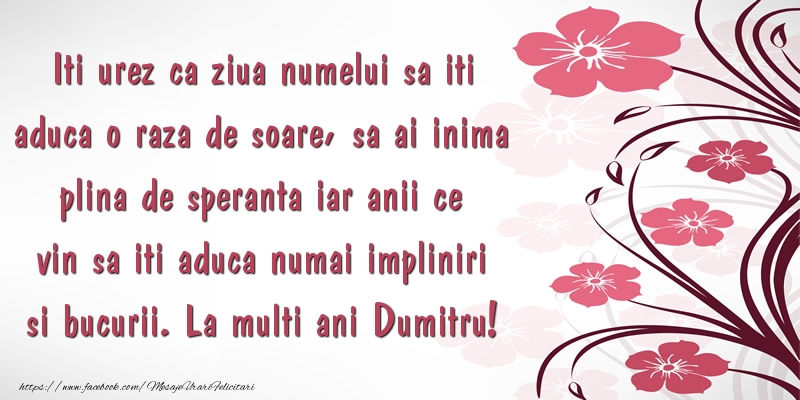 La mulți ani, Dumitru! Îți urez ca ziua ta onomastică să îți aducă o raza de soare, să ai inima plină de speranță iar în lume să găsești numai fericire. La Mulți Ani, Dumitru!