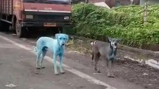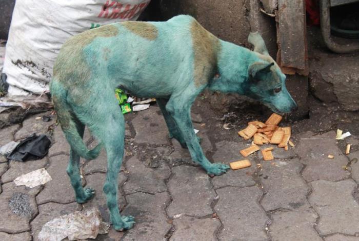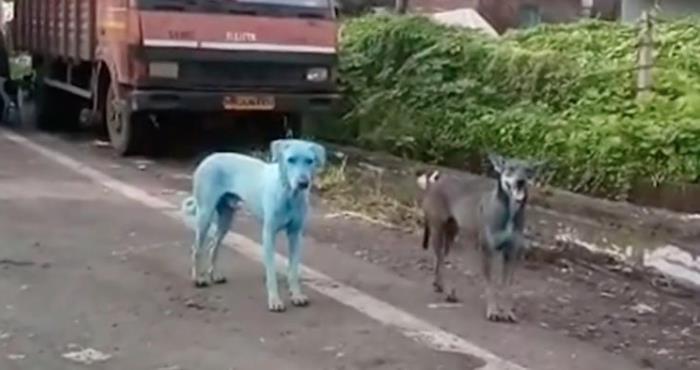 Cainii vagabonzi cu blana albastra si stralucitoare au atras atentia trecatorilor de pe strazile metropolei indiene. Cei mai multi dintre ei se aflau in cartierul Taloja, unde se afla aproximativ o mie de fabrici de produse chimice si farmaceutice. Oamenii s-au speriat la vederea animalelor colorate ciudat si au alertat autoritatile, care au inceput sa investigheze de ce au cainii de pe strazi blana albastra.