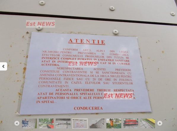 De exemplu, conform dezvaluirilor facute de publicatia estnews.ro, in interiorul Spitalului Judetean de Urgenta Vaslui, pacientii fumeaza si consuma bauturi alcoolice. Asta in conditiile in care fumatul in unitatile de sanatate a fost interzis inca din anul 2002, prin Legea 349, iar consumul de alcool in spatiile publice e interzis.