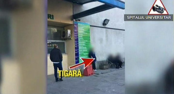 In curtea spitalului Universitar sunetul brichetelor care se aprind se aude la tot pasul. In mod normal, tigarile nu au ce sa caute dincolo de poarta unei unitati medicale. Dar regula nu e respectata de nimeni.