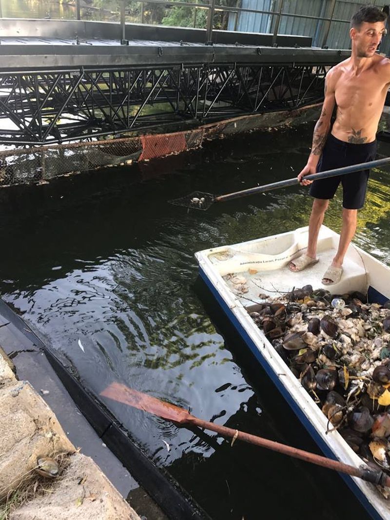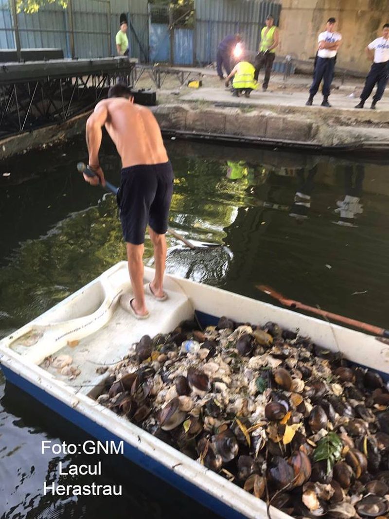 4 din 5 | Lacul Herastrau e plin de scoici moarte, din cauza caniculei. Garda de Mediu a scos 4,6 tone de scoici din apa. Ce spun biologii despre soarta pestilor din lac