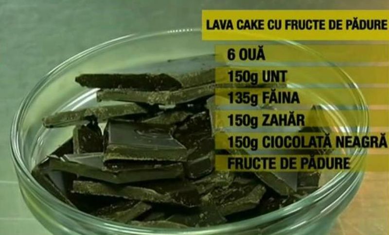Se face din 6 oua, 150 gr unt, 135 gr faina, 150 gr zahar, 150 gr ciocolata neagra, fructe de padure si unt pentru a unge formele.